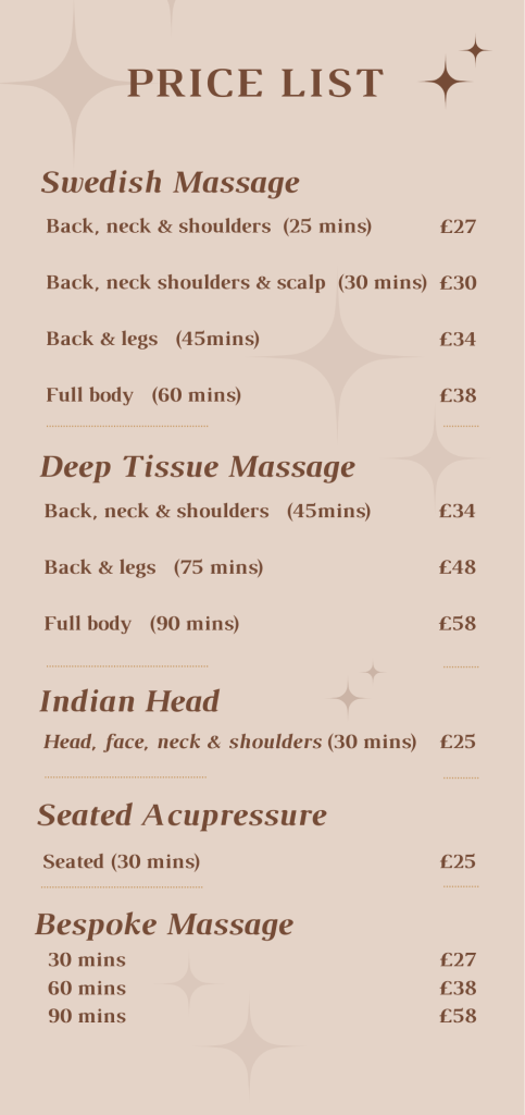 Some conditions may be contraindicated for massage, and some may require your GP’s approval. If you are suffering from undiagnosed pain, we recommend consulting your doctor prior to having a massage.
