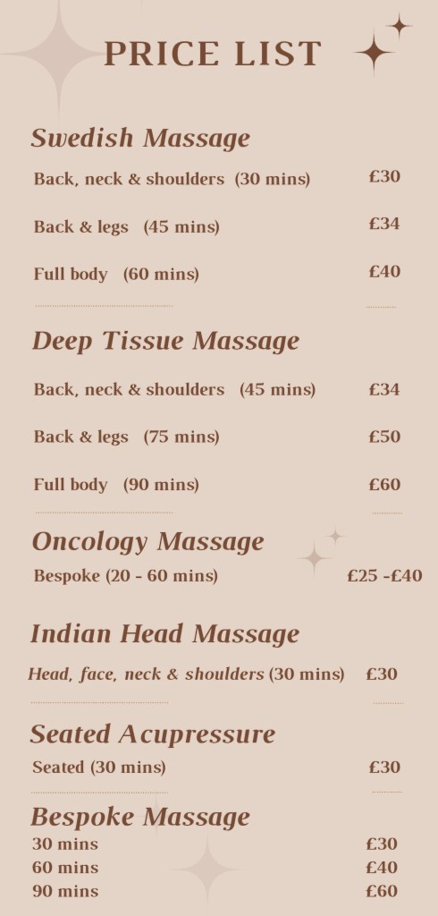 I also have many years of experience working with individuals with neurological conditions, and mobility difficulties, making me well placed to offer massage to people who may otherwise have difficulty accessing complementary therapies. We have several moving and handling aides available to us and may be able to provide assistance onto and off of the couch, or provide a seated alternative.